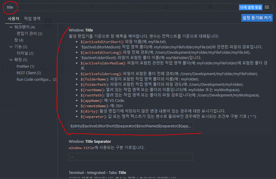 2. 상단에 있는 "설정 검색" 부분에 title 검색